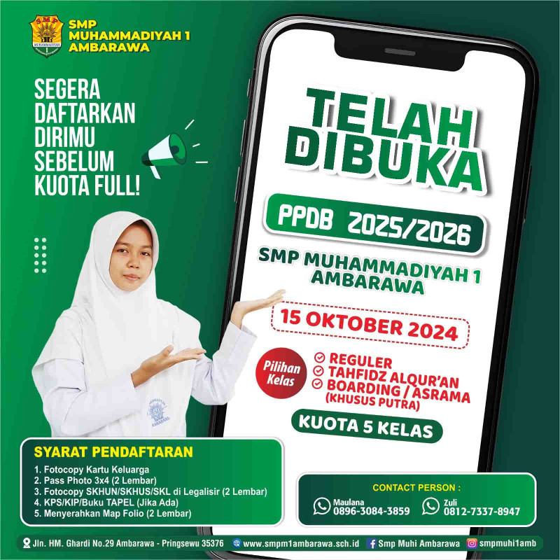 Kami mengundang Anda untuk bergabung bersama kami di SMP Muhammadiyah 1 Ambarawa. Pendaftaran dibuka mulai 15 Oktober 2024. Jangan lewatkan kesempatan untuk memberikan pendidikan terbaik bagi putra-putri Anda.